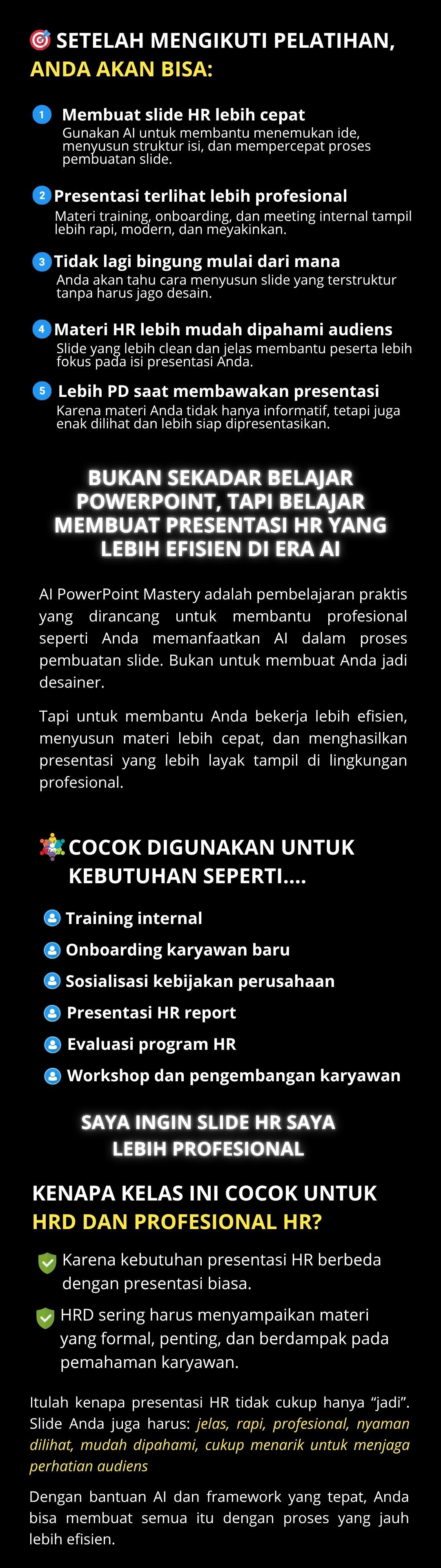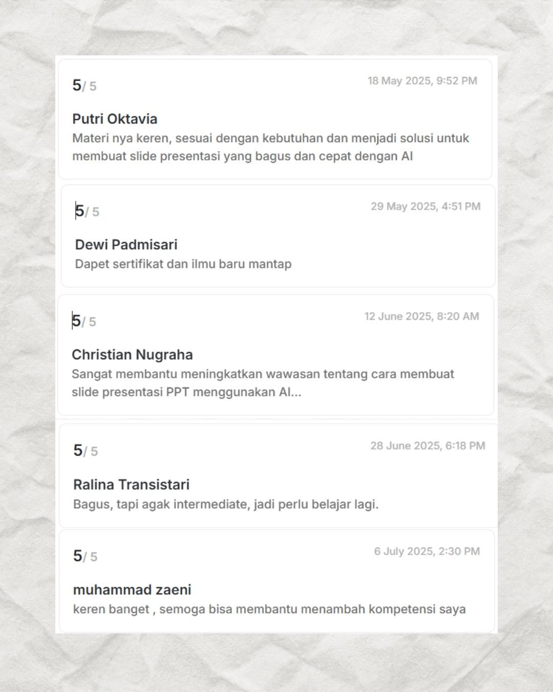 Kursus PowerPoint Mastery ini dirancang untuk memberikan panduan dan keterampilan dalam menggunakan Microsoft PowerPoint secara efektif. Namun, hasil yang Anda dapatkan dari kursus ini bergantung pada dedikasi, kemampuan, dan usaha Anda dalam mengaplikasikan materi yang diajarkan.