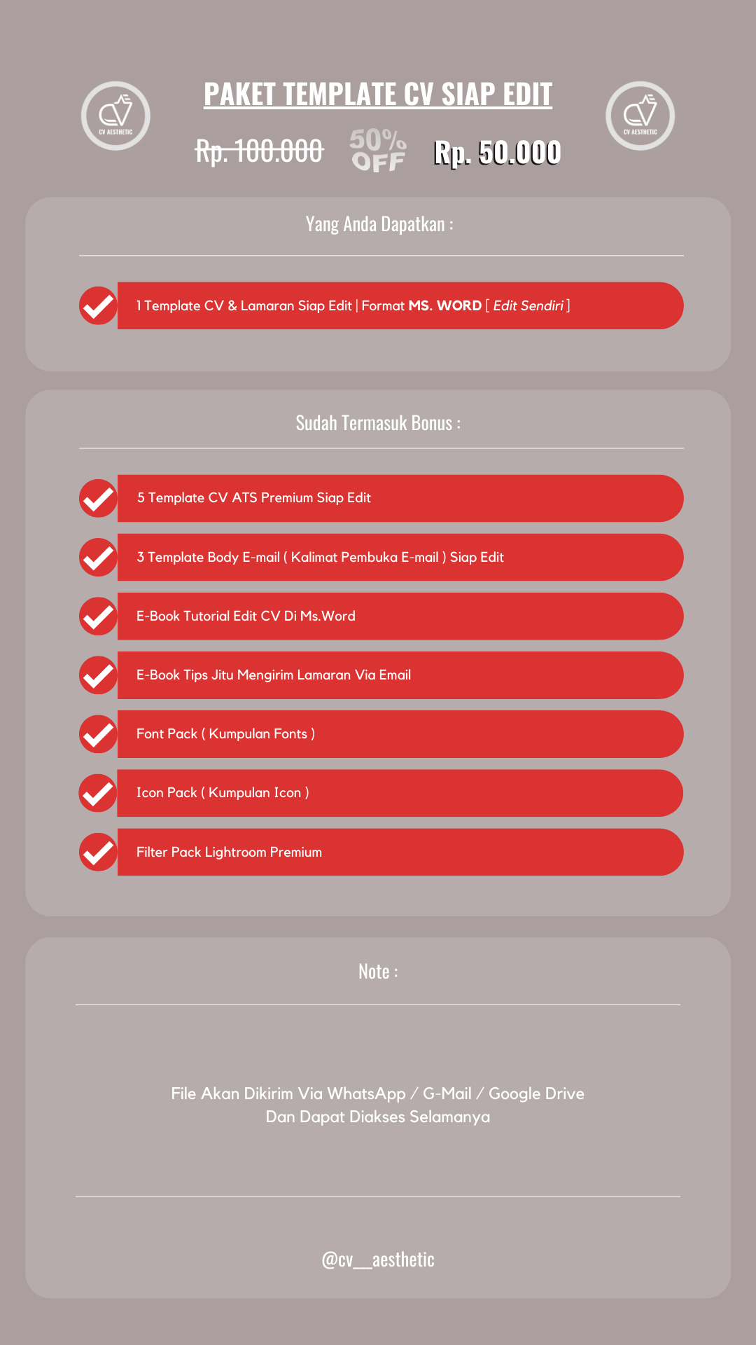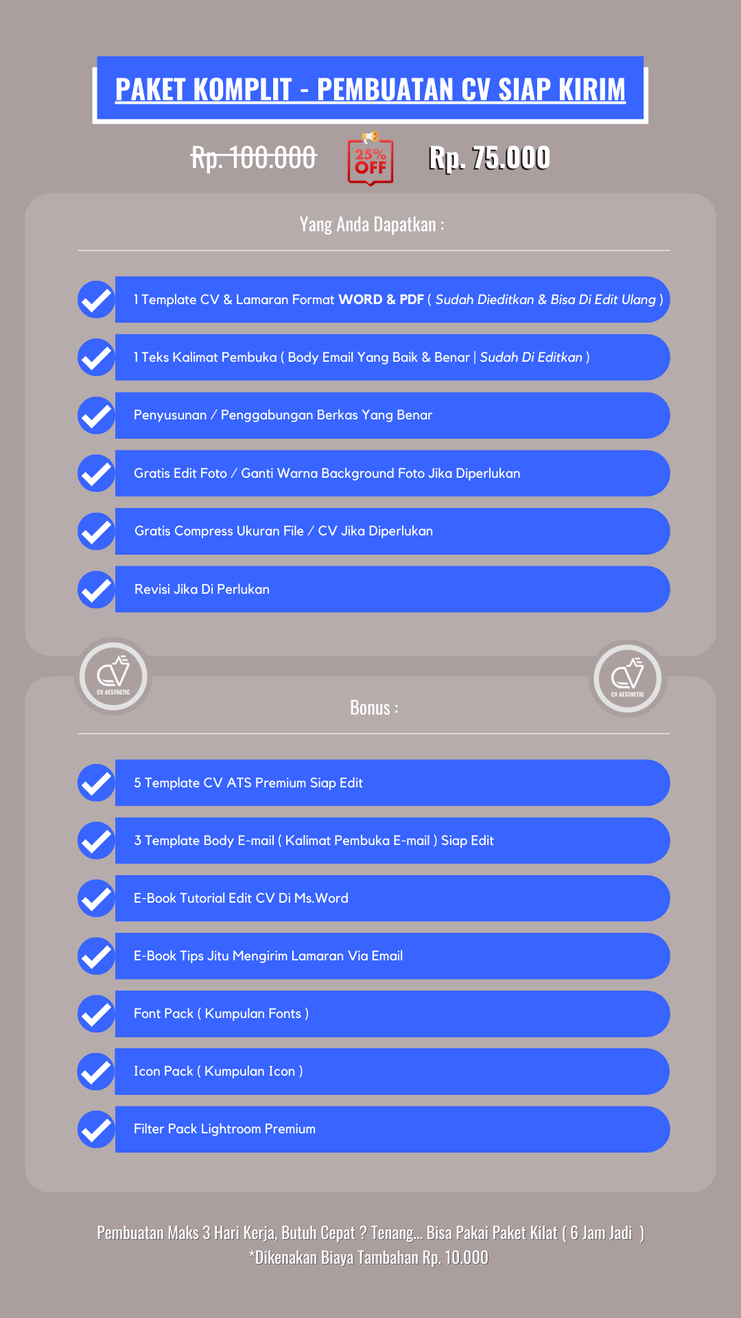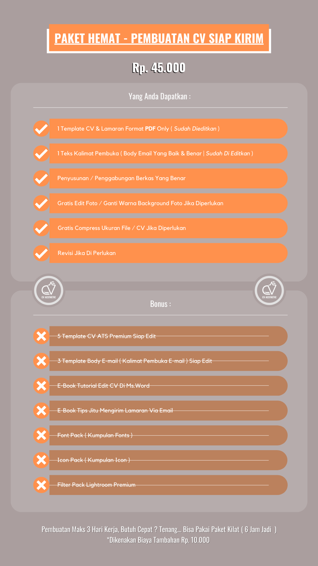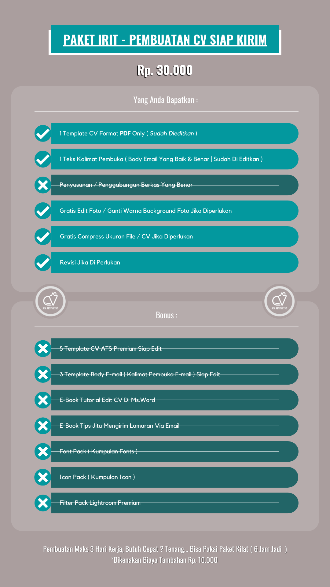 Paket Pembuatan CV Siap Kirim Ini Cocok Untuk Anda Yang Membutuhkan CV Secara Instan Dengan Ketentuan Paket Seperti Di Bawah Ini ;
