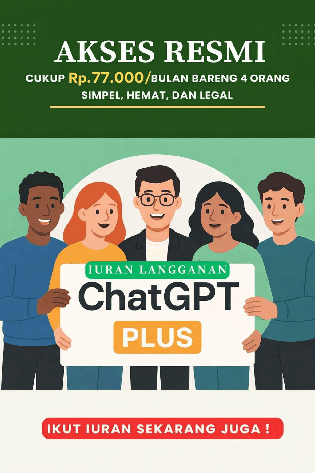 Sekarang kamu bisa patungan legal bareng 5 orang lainnya, cukup Rp77.000/bulan udah dapet akses ChatGPT $20/month + pajak+ Biaya Admin!