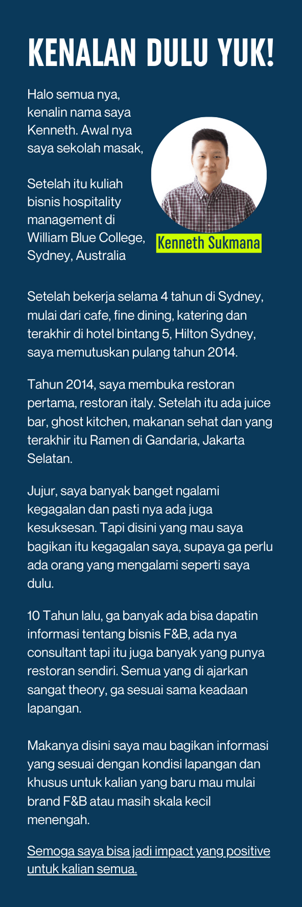 Maka dari itu, setelah mengalami trial error selama 10 tahun terakhir, saya mau share pengalaman saya supaya pebisnis F&B lain tidak melakukan kesalahan sama seperti saya.