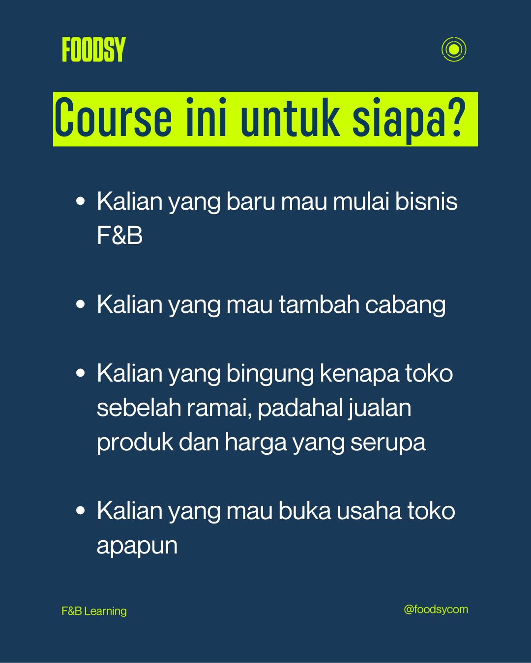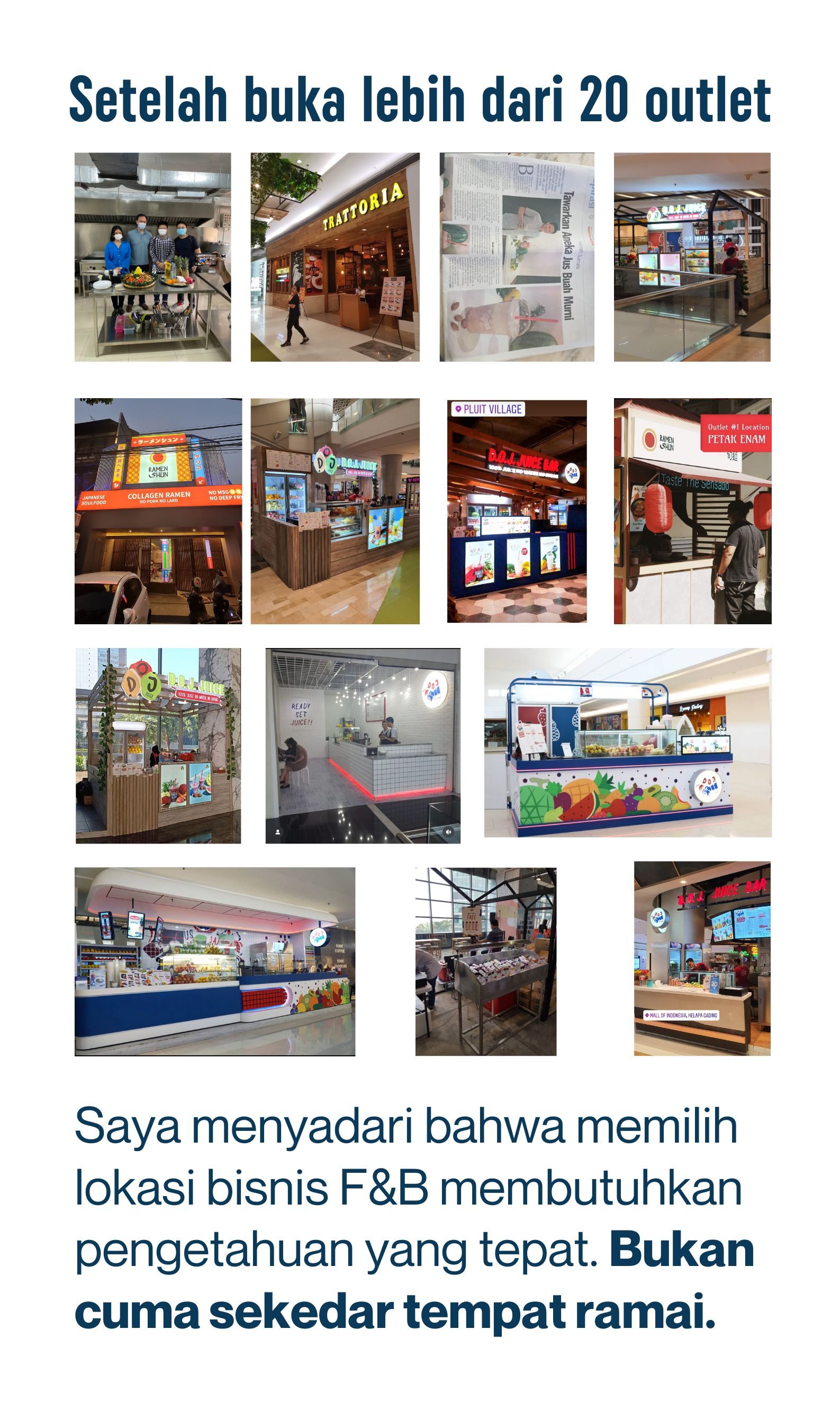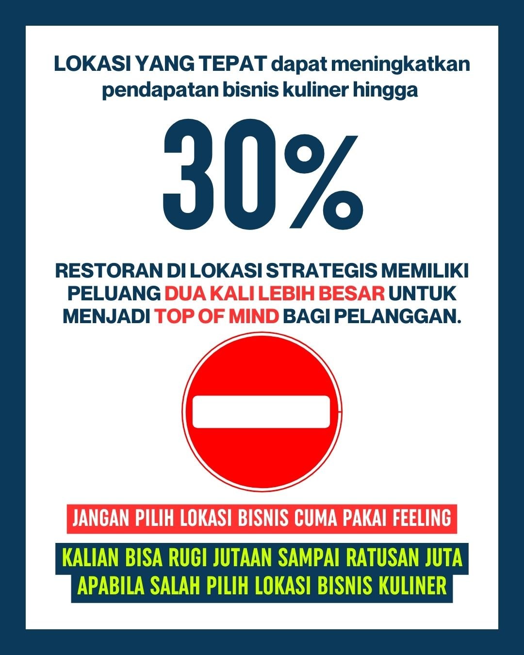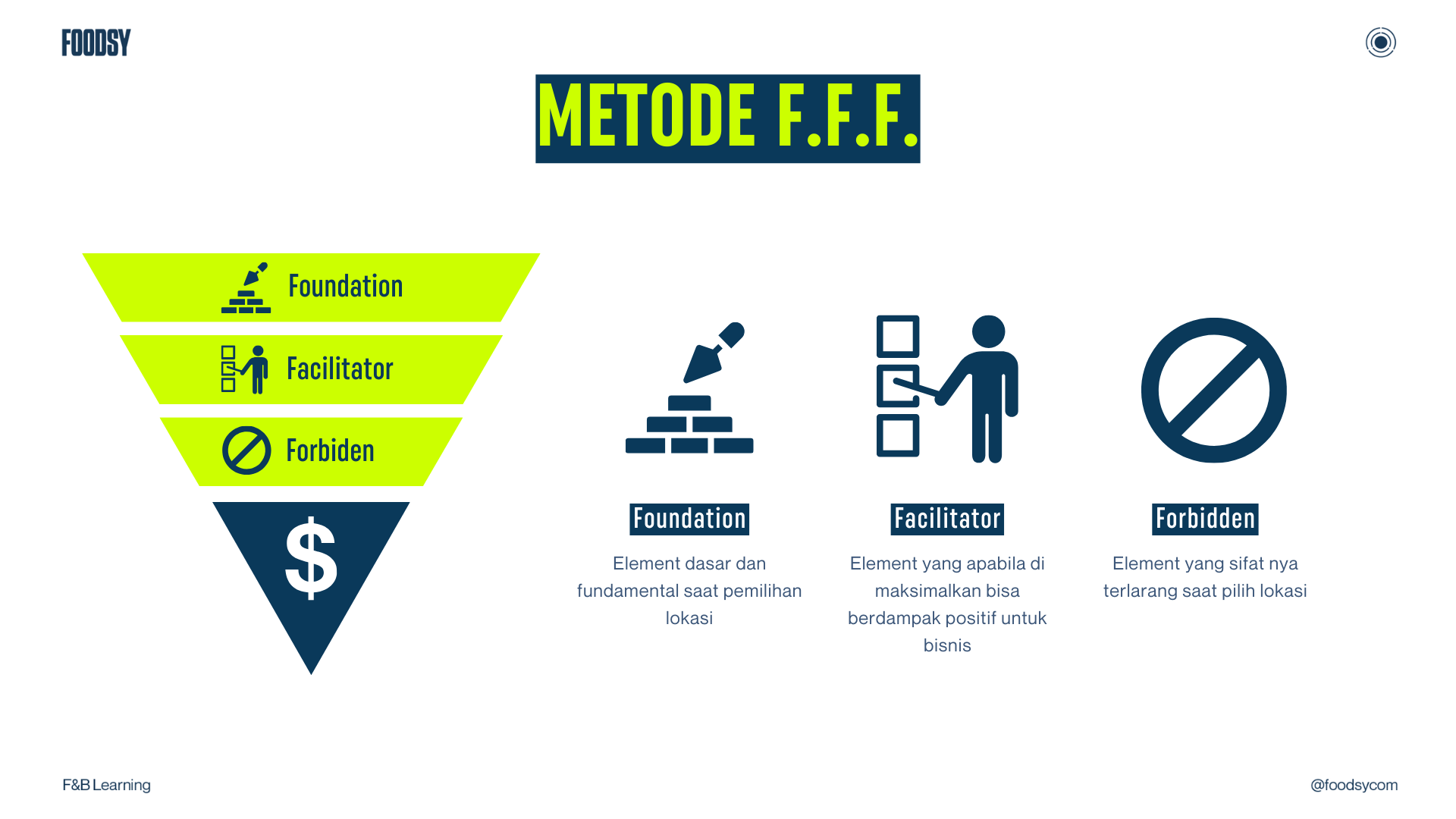 Dari pengalaman saya buka berbagai usaha F&B, mulai dari mall, perkantoran, ghost kitchen, sampai ruko, saya merumuskan sebuah framework pemilihan lokasi yang bisa diterapkan di mana saja. Saya sebut itu metode 3F: Foundation, Facilitator, Forbidden.