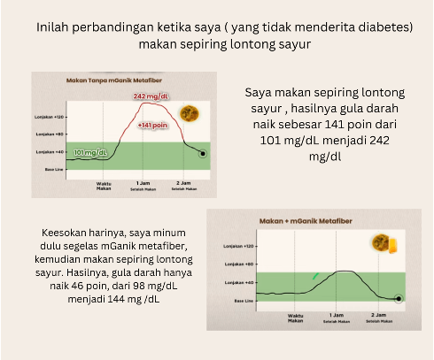 Dengan minum MGanik Metafiber setiap kali sebelum makan. Gula darah Anda tidak  akan melonjak. Serat pada metafiber akan menghambat kenaikan gula darah .
