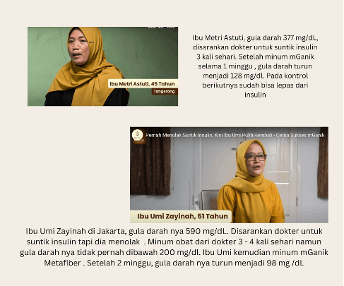 Berikut ini , adalah pengalaman dua orang ibu penderita Diabetes yang mengalami penurunan gula darah setelah minum mGanik metafiber