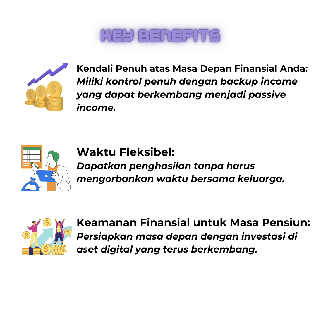 Sekarang saatnya Anda mengambil kendali atas masa depan Anda. Jadikan aset digital sebagai solusi untuk backup income yang terus berkembang menjadi passive income, tanpa mengorbankan waktu bersama keluarga