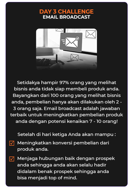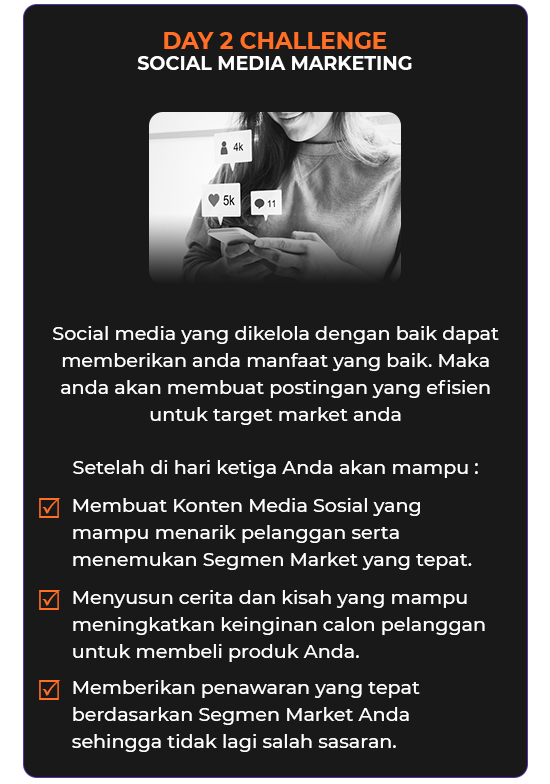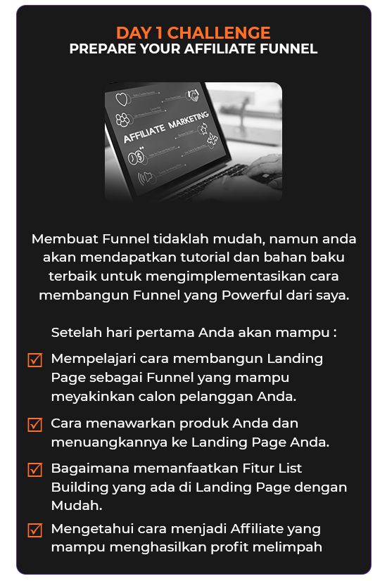 Dalam tantangan ini, Anda akan diberikan langkah-langkah untuk membuat funnel pertama Anda, teknik berpromosi melalui media sosial untuk mengarahkan traffic ke funnel Anda, serta mengoptimasi funnel Anda.