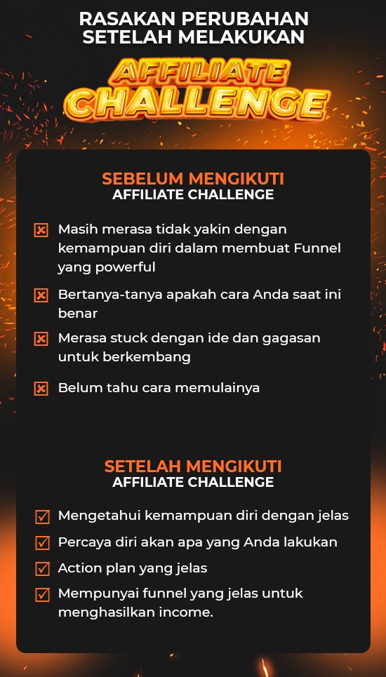 Affiliate Challenge adalah sebuah tantangan untuk Anda yang suka mencari peluang dan mengubahnya menjadi sumber pendapatan. Tantangan ini akan mengajarkan cara memanfaatkan peluang untuk menjadi affiliate marketer yang efektif.