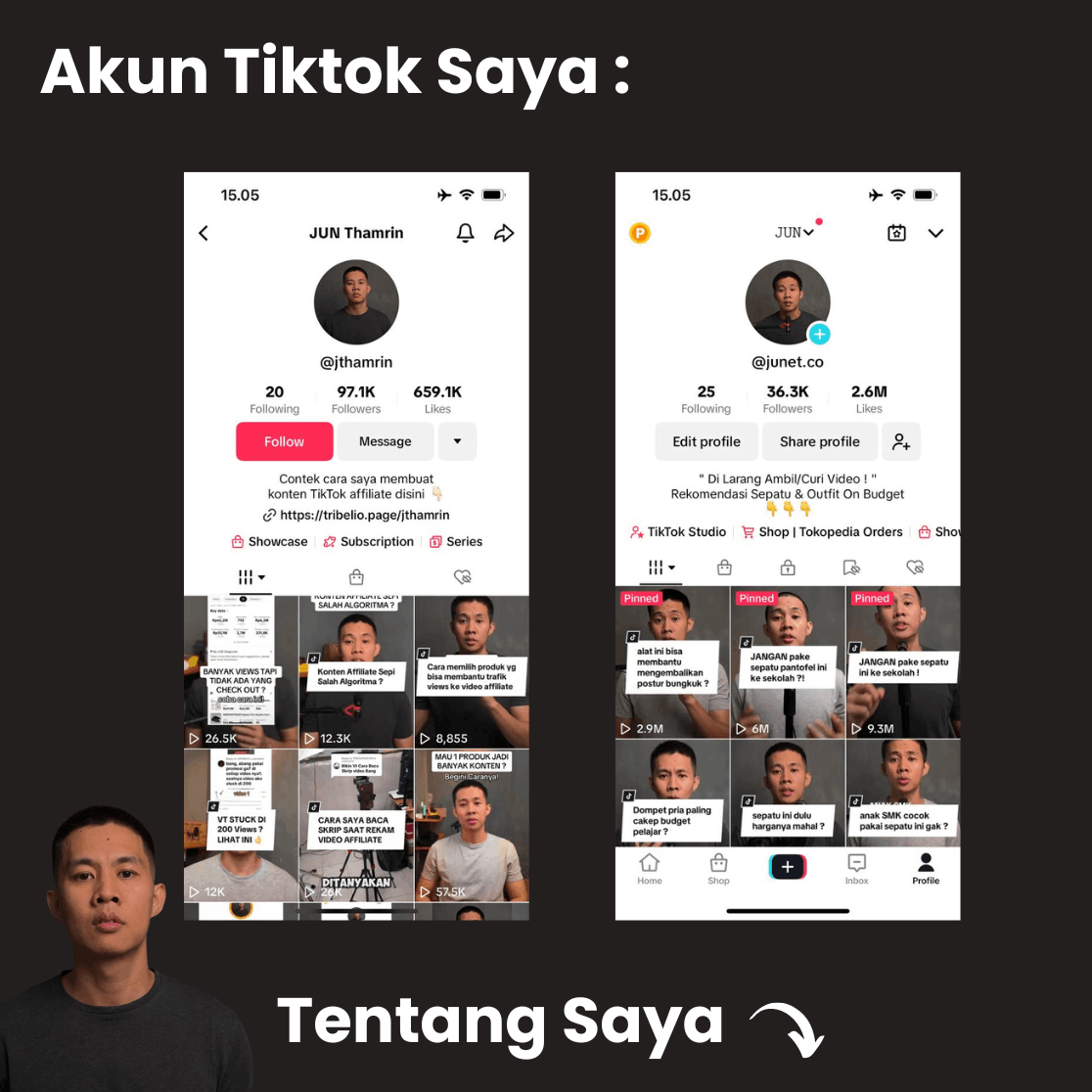 @junet.co ( akun affiliate ) dan @jthamrin ( Akun Edukasi ) , saya sudah 2 tahun lebih sebagai affiliator di TikTok.